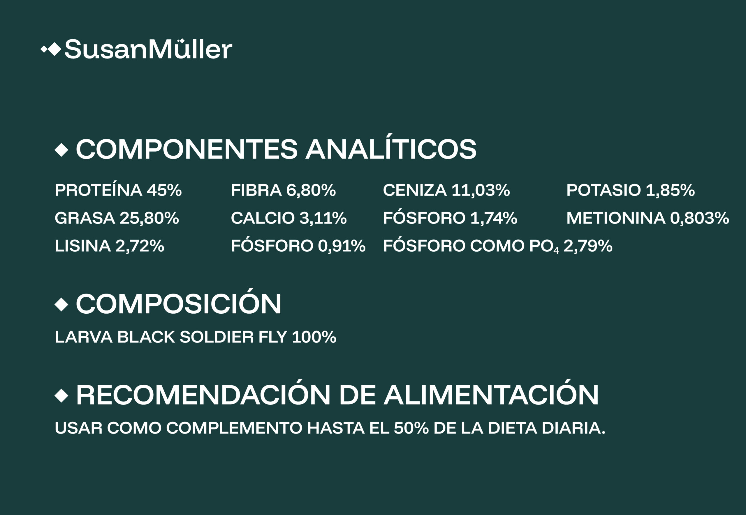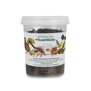 Las larvas deshidratadas de Hermetia illucens destacan por su excelente perfil nutricional, superior al de otros insectos como los gusanos de la harina. Aportan una combinación equilibrada de proteínas altamente digestibles, minerales esenciales y un valioso extra de calcio, fundamental para la salud ósea y el desarrollo de los animales. Además, su producción es eficiente y sostenible, lo que las convierte en la opción perfecta como complemento natural y de alta calidad en la dieta de reptiles, aves, peces y pequeños mamíferos.