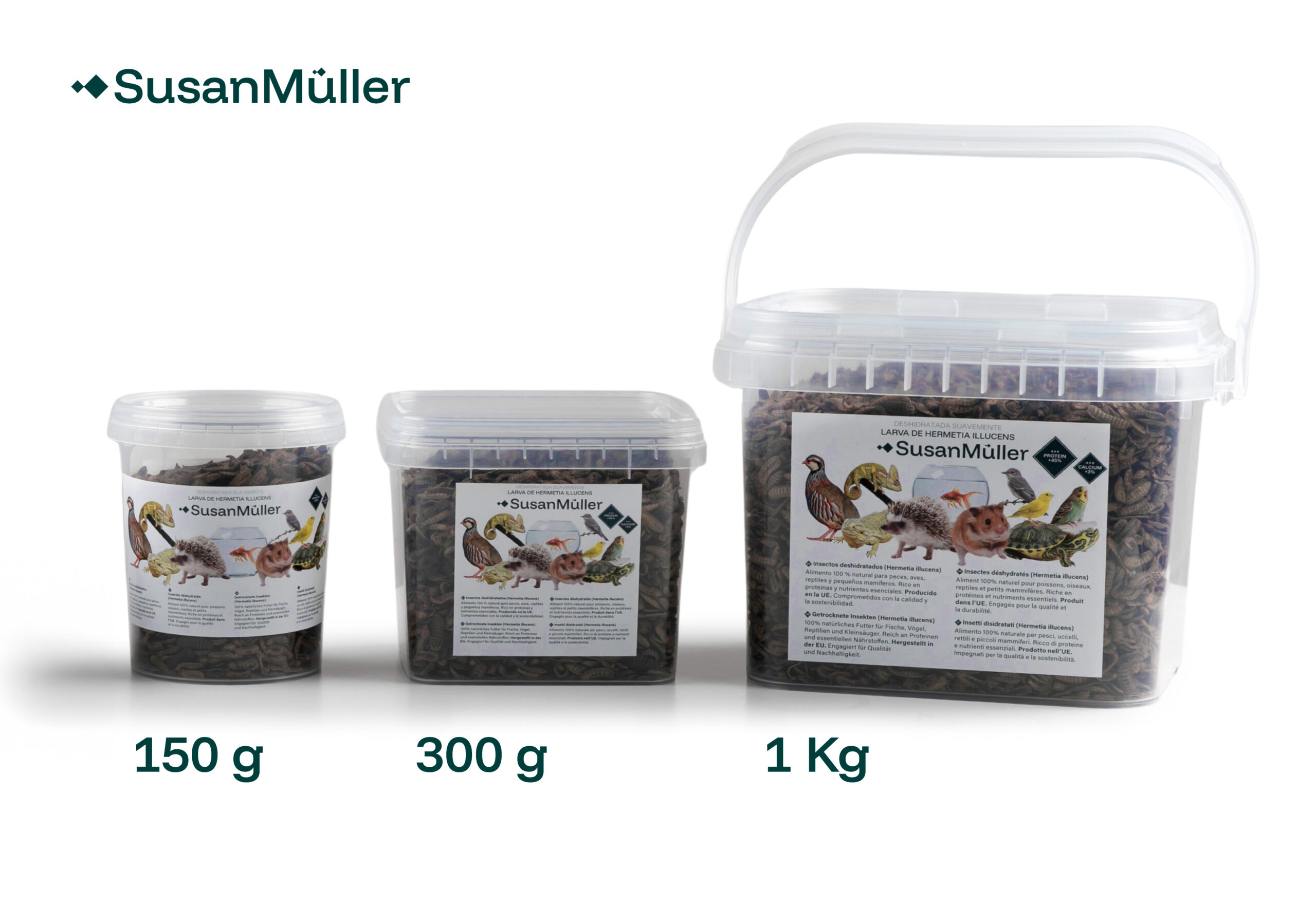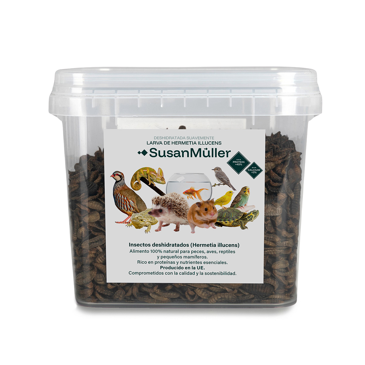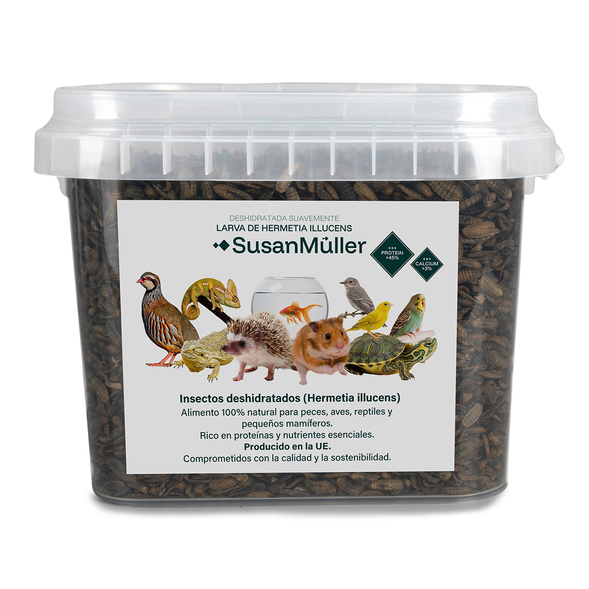 Las larvas deshidratadas de Hermetia illucens ofrecen un aporte natural de proteínas, aminoácidos esenciales y grasas saludables, ideales para favorecer el crecimiento y la vitalidad de los animales. Su contenido en calcio es significativamente superior al de otros insectos como los gusanos de la harina, lo que contribuye al desarrollo de huesos y caparazones fuertes. Gracias a su alta densidad nutricional, permiten optimizar la alimentación y reducir la necesidad de otros complementos o piensos.