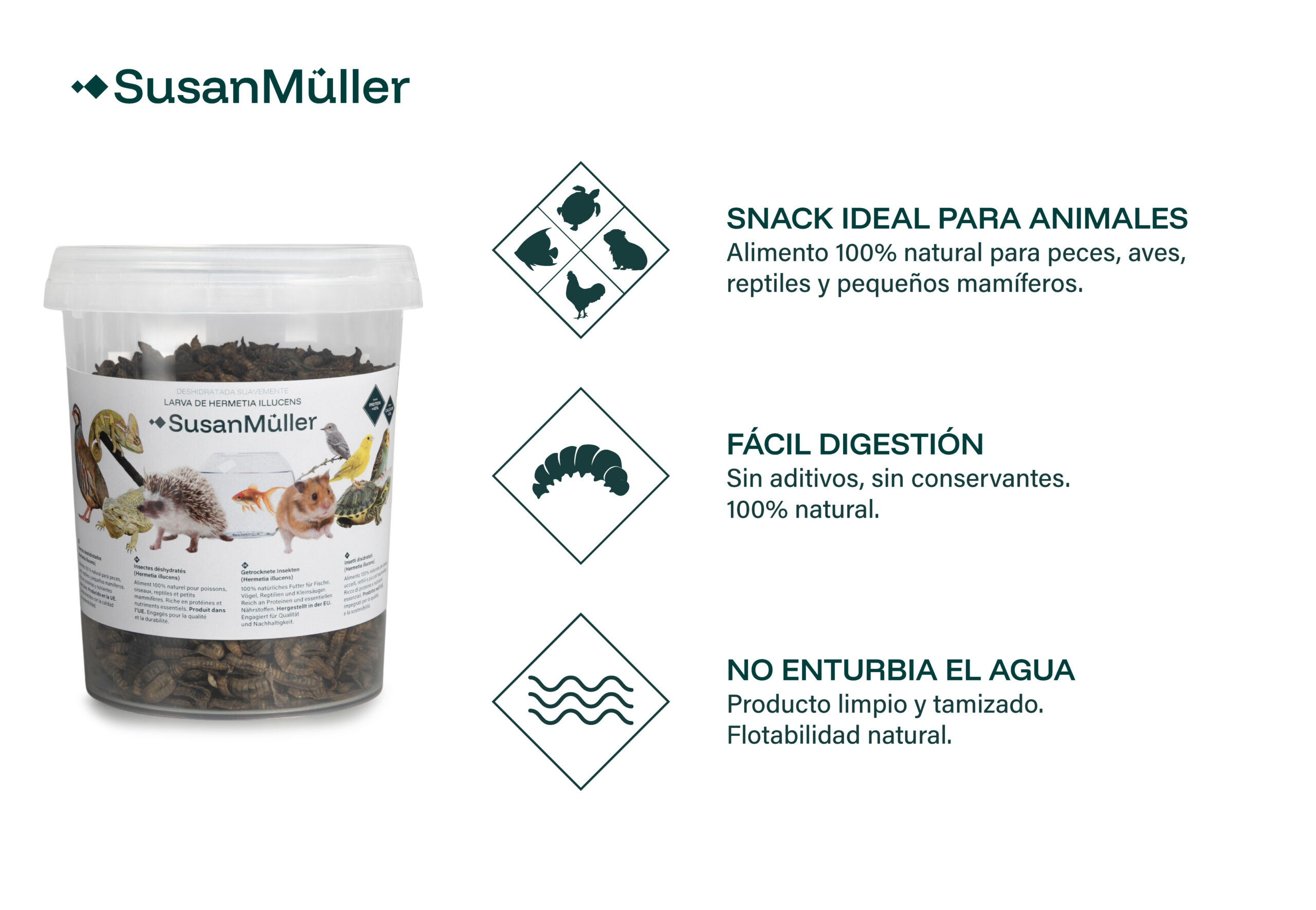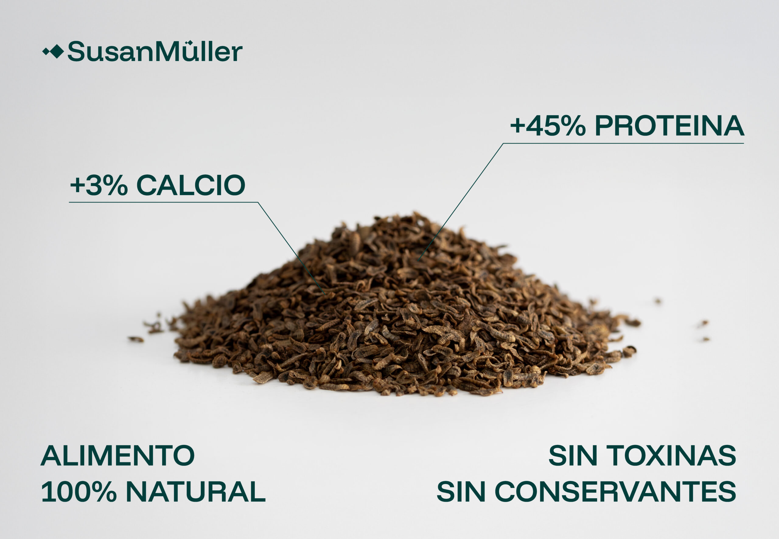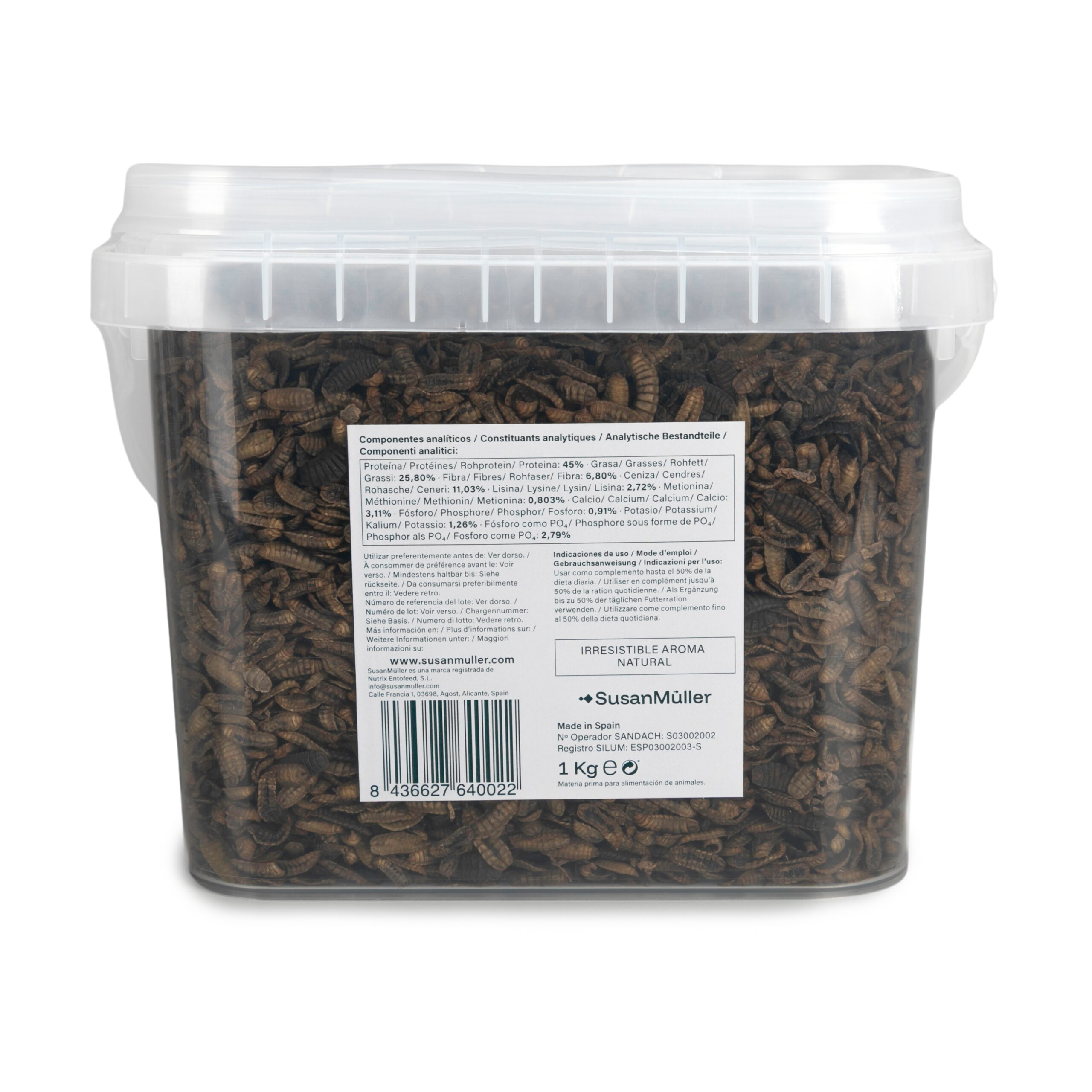 Nuestro alimento está compuesto exclusivamente por larvas deshidratadas de Hermetia illucens, sin conservantes, aditivos ni colorantes artificiales. Un producto 100% natural, limpio y de alta calidad. Gracias a su suave proceso de secado, conservan un aroma natural y agradable que resulta irresistible para los animales. Se presenta en un práctico envase reciclable que las mantiene en perfecto estado: sin olores desagradables, sin roturas y con las larvas enteras, tal y como deben ser.